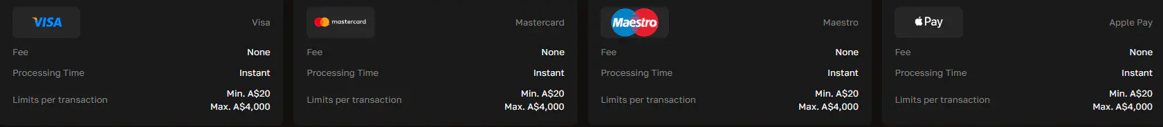 | Cryptocurrencies | AUD – No especificado | Instant | AUD 20 – AUD 4.000 | Instant |