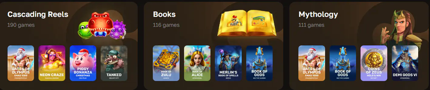 - Slots: We present a vast collection of slots, featuring the best games. You’ll find titles with classic gameplay as well as more modern options, different themes, jackpots, and styles. The category of slots presents a whole universe of choices.