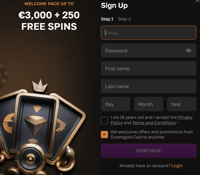 Visit the CrownGold Casino website and click the Sign Up button. Fill in the required details—name, email, and contact information. Create a strong password and confirm your registration.